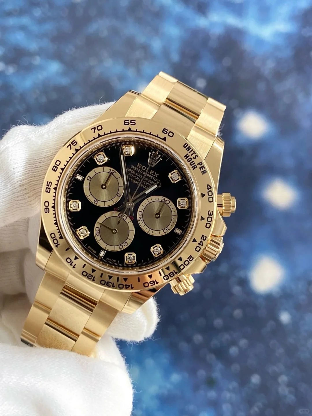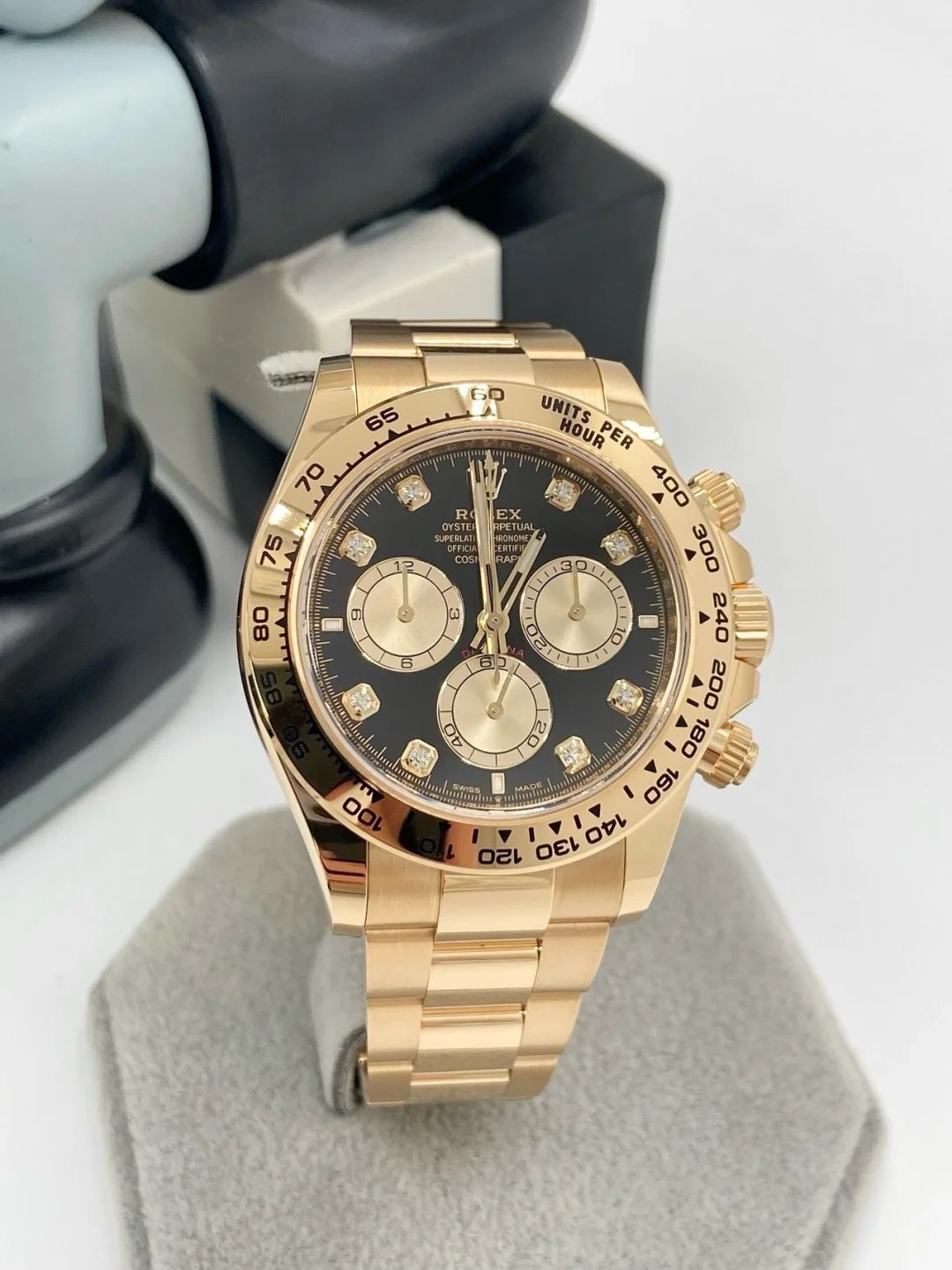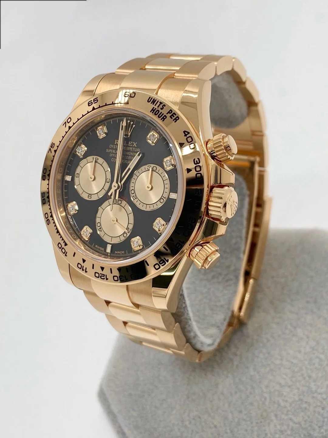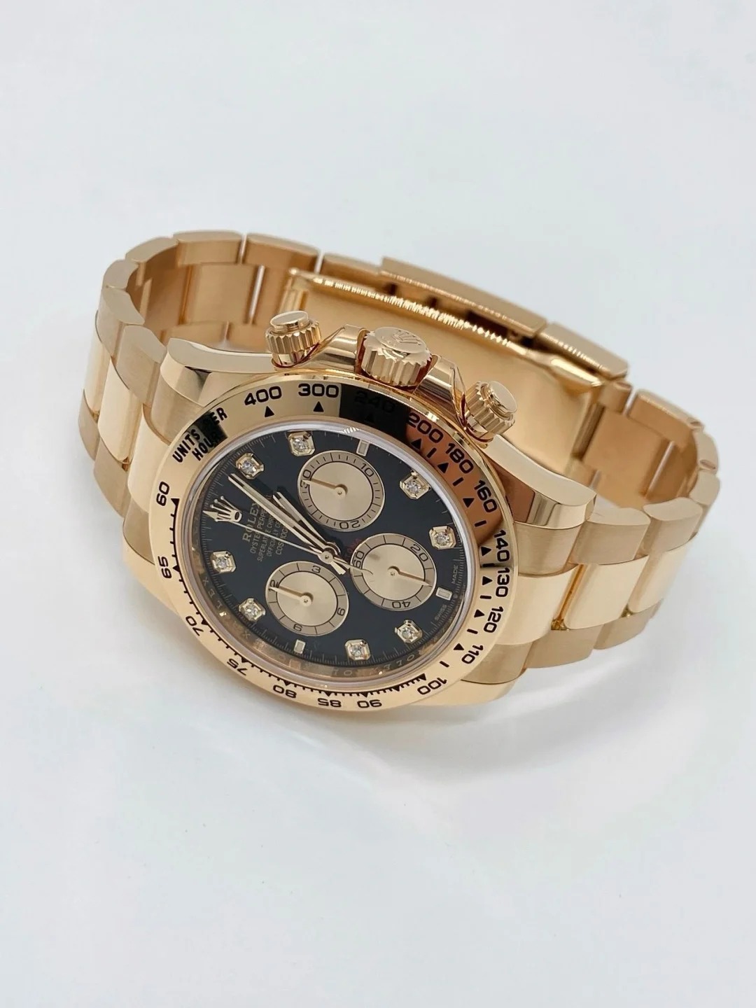 The Oyster Perpetual Cosmograph Daytona in 18 ct yellow gold features a shiny black and gold diamond-set dial and an Oyster bracelet with an engraved tachymeter on the 18-carat yellow gold bezel. -m126508-0003 40mm