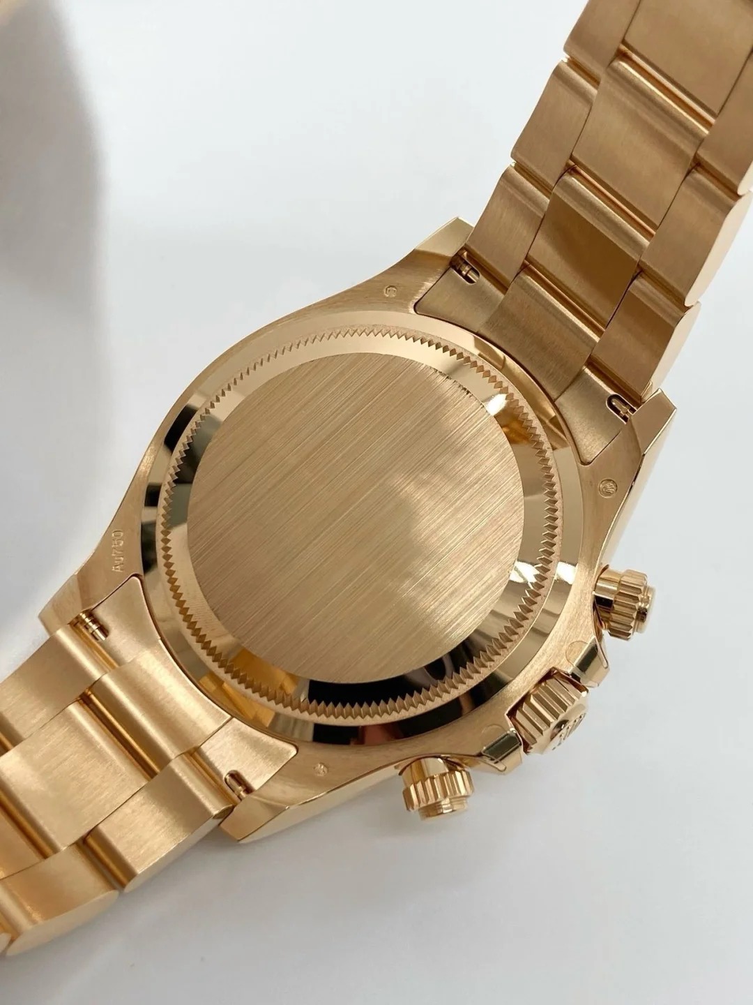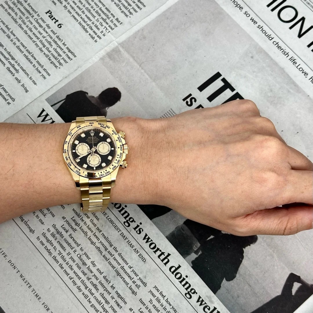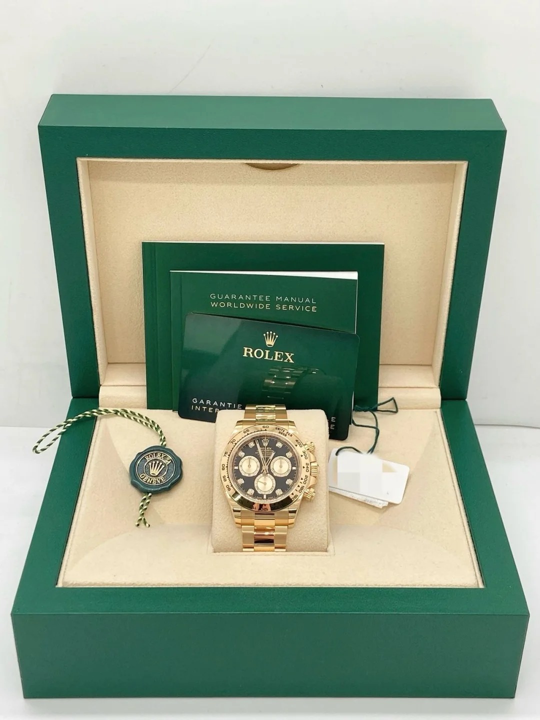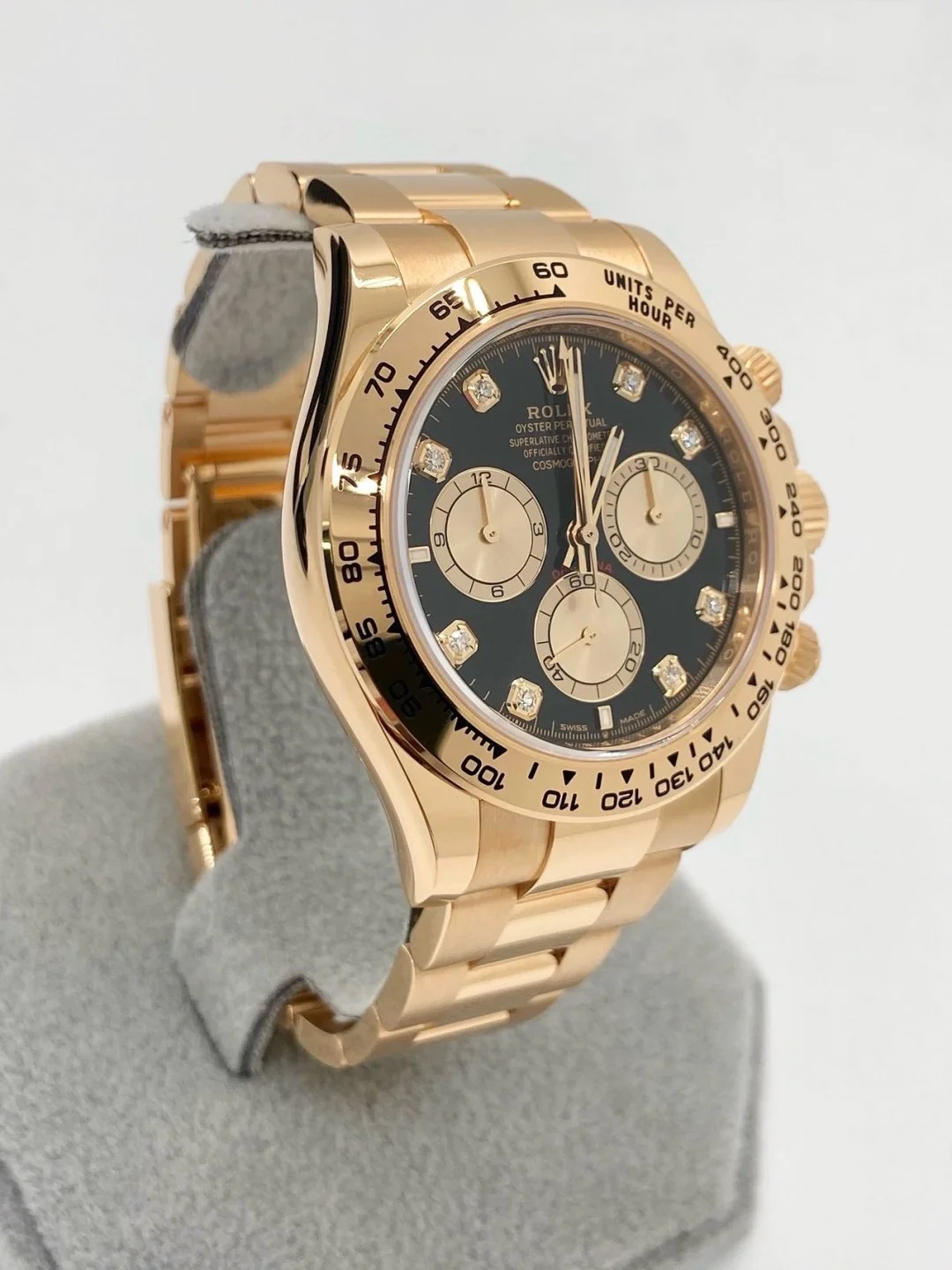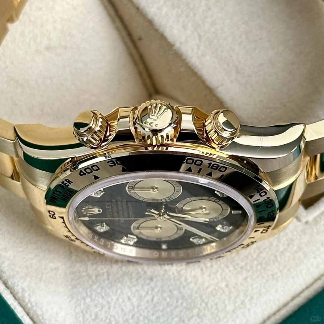 The Oyster Perpetual Cosmograph Daytona in 18 ct yellow gold features a shiny black and gold diamond-set dial and an Oyster bracelet with an engraved tachymeter on the 18-carat yellow gold bezel. -m126508-0003 40mm