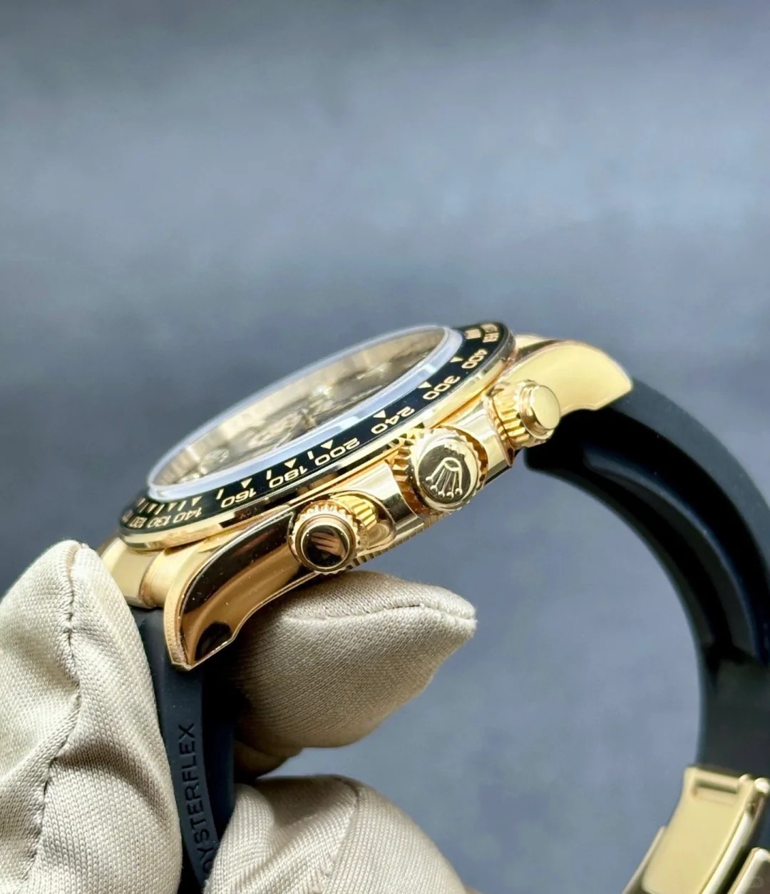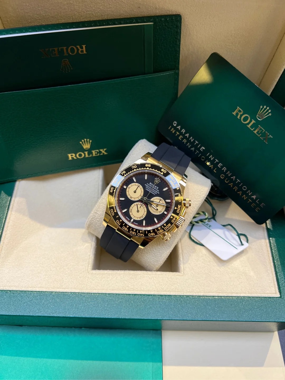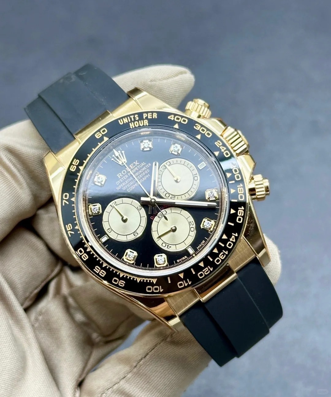 The Oyster Perpetual Cosmograph Daytona in 18K yellow gold features a shiny black and gold diamond-set dial and an Oysterflex bracelet with a black Cerachrom bezel with a tachymeter. -m126518ln-0006 40mm