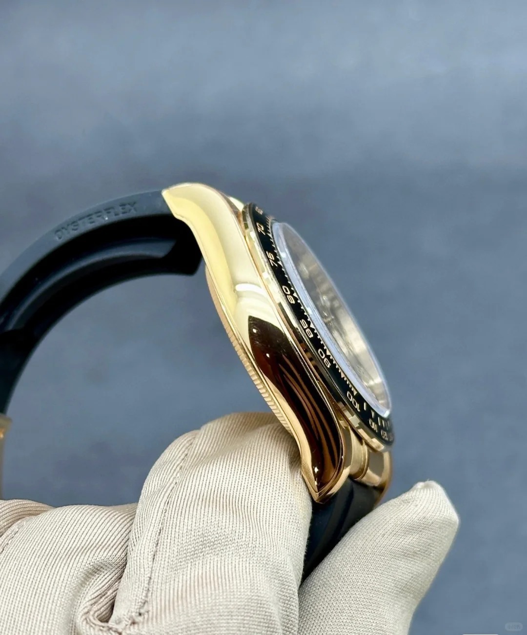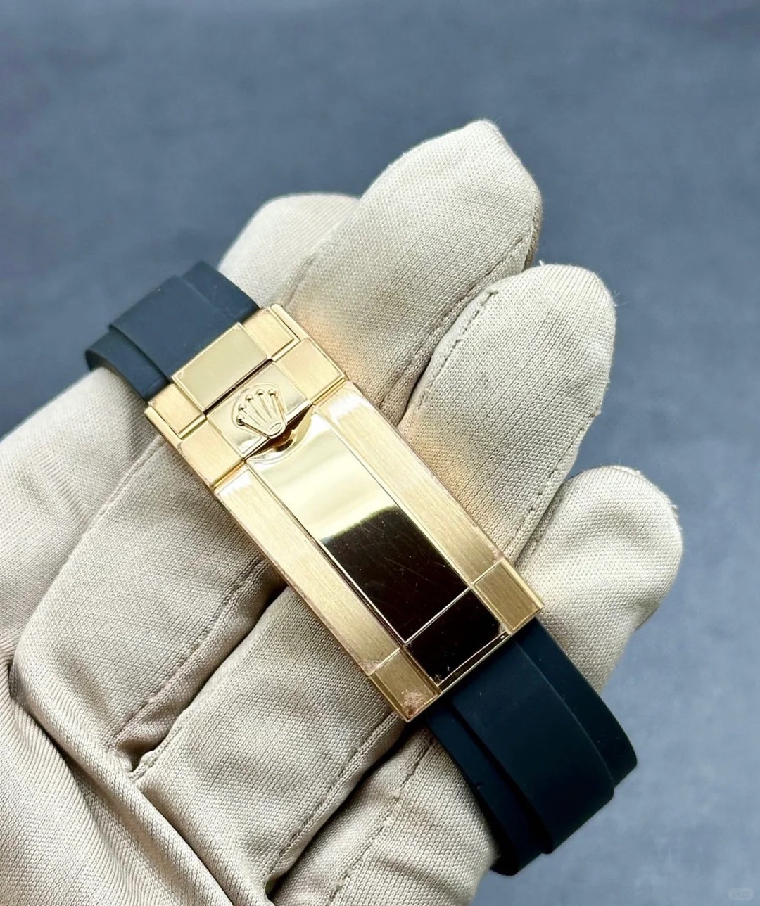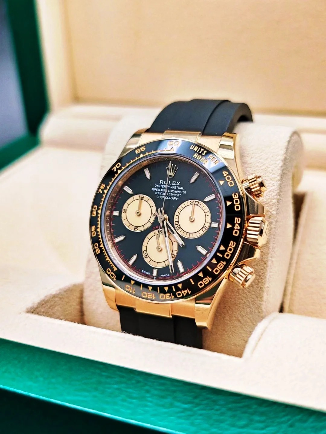 The Oyster Perpetual Cosmograph Daytona in 18K yellow gold features a shiny black and gold diamond-set dial and an Oysterflex bracelet with a black Cerachrom bezel with a tachymeter. -m126518ln-0006 40mm