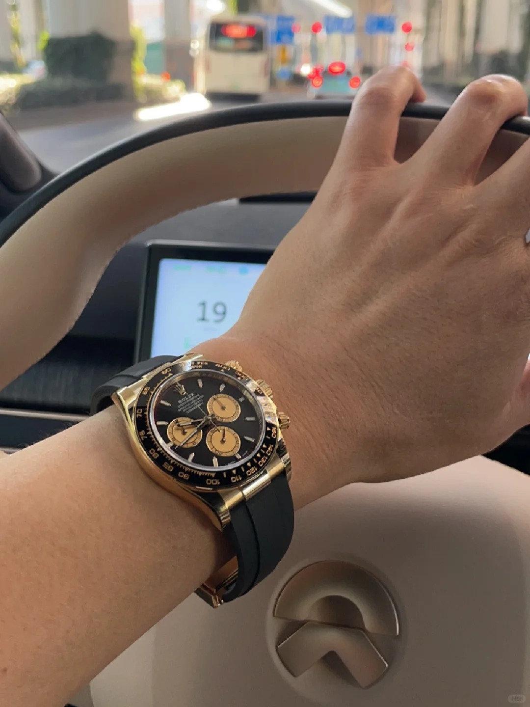 This Oyster Perpetual Cosmograph Daytona in 18 ct yellow gold, with a bright black and golden, diamond-set dial and an Oysterflex bracelet, features a black Cerachrom bezel with tachymetric scale.