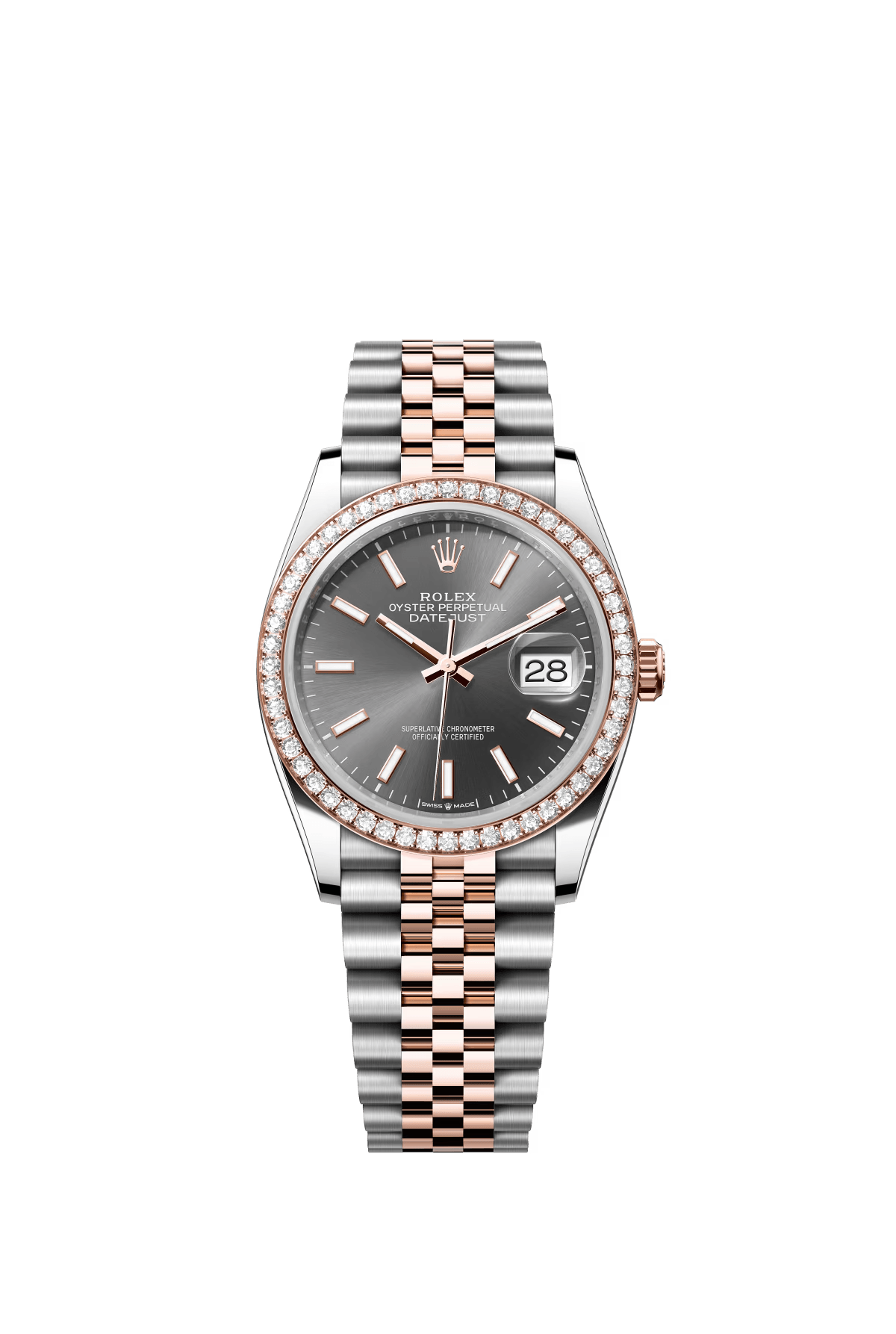 • The Oyster Perpetual Datejust 36 is available in Everose gold and Oystersteel, with a slate grey dial and a Jubilee bracelet. -m126281rbr-0001