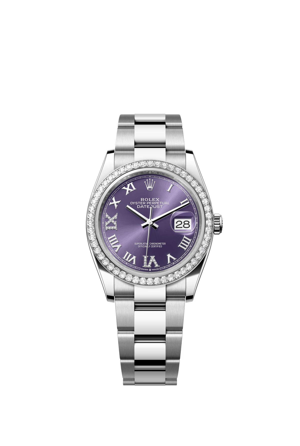 The Oyster Perpetual Datejust 36 is available in white gold and Oystersteel, with a diamond-set eggplant purple dial and an Oyster bracelet. -m126284rbr-0014