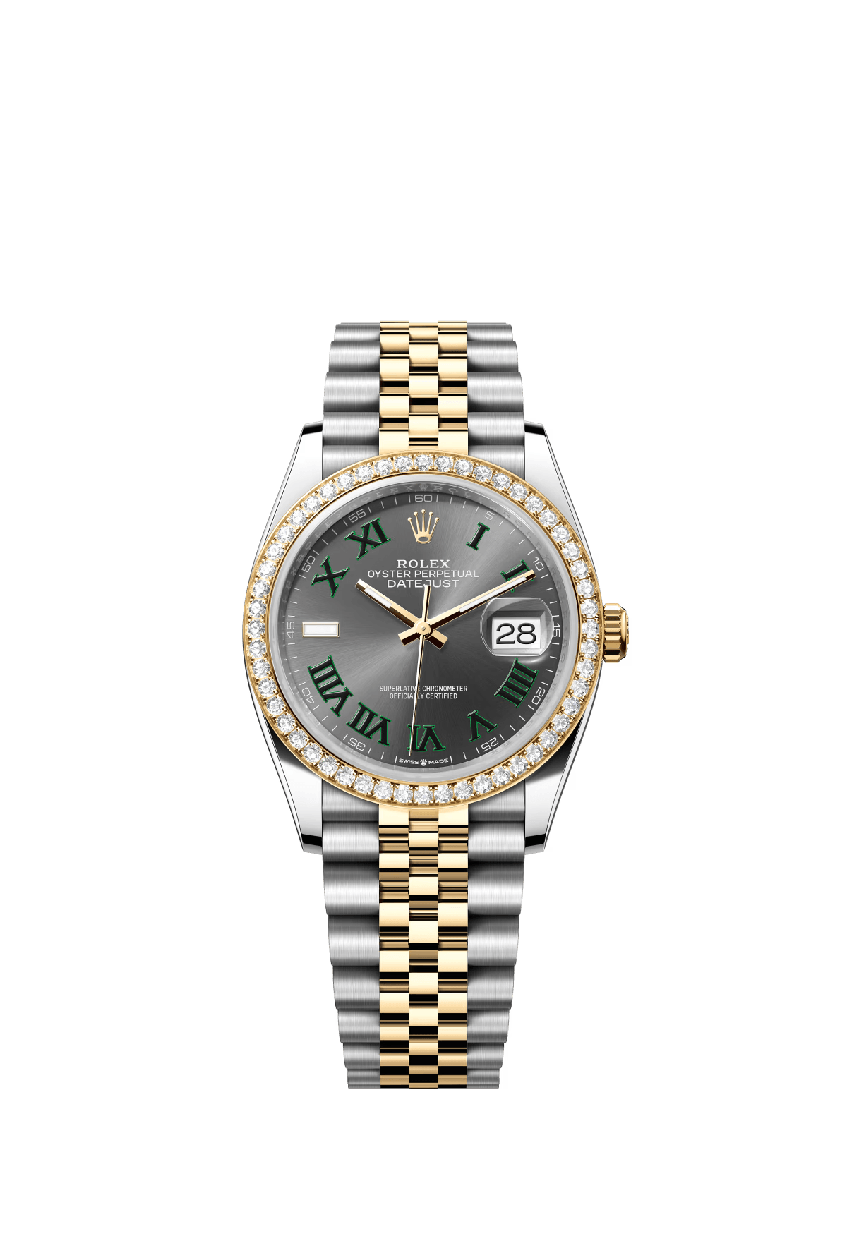 The Oyster Perpetual Datejust 36 is available in yellow gold and Oystersteel with a slate-grey dial and a Jubilee bracelet. -m126283rbr-0021