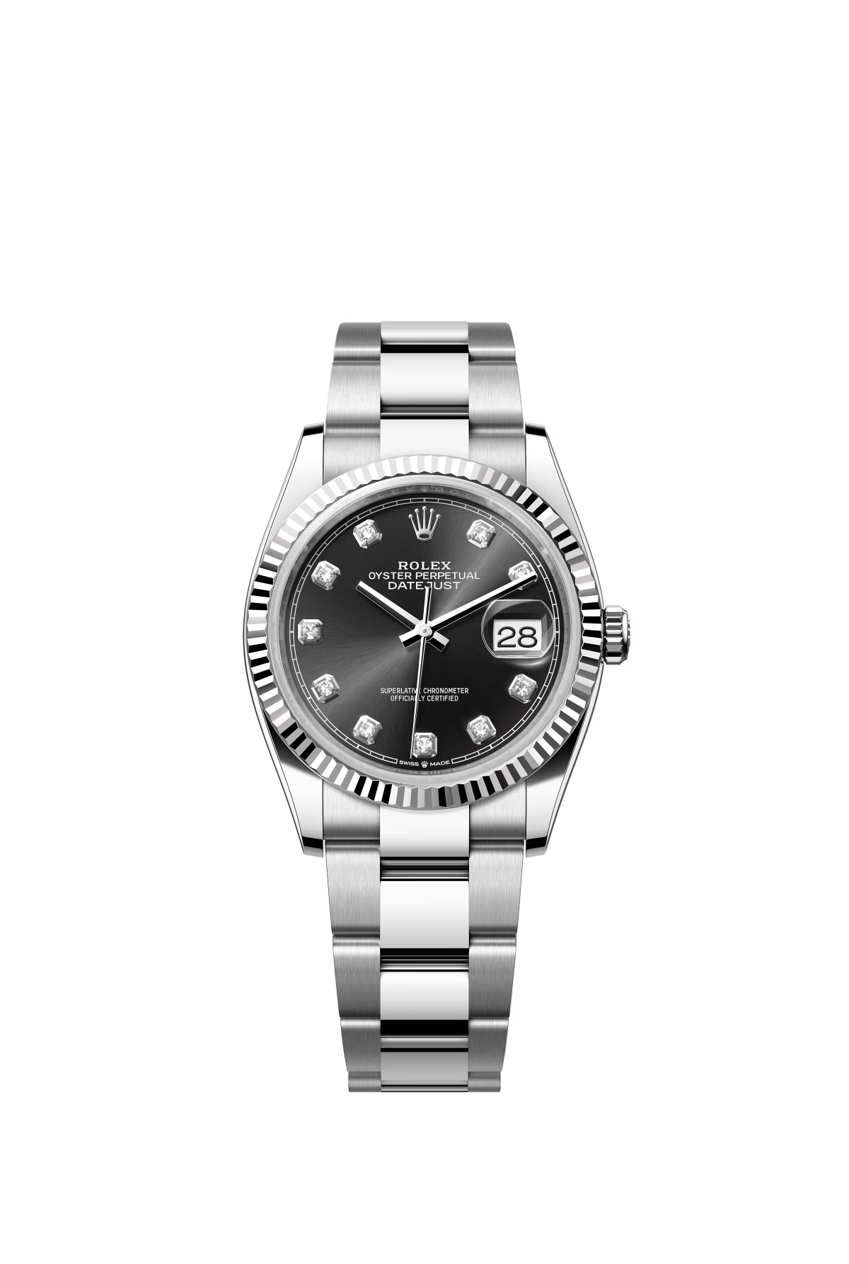 • The Oyster Perpetual Datejust 36 is available in white gold and Oysteel, with a glossy black diamond-set dial and an Oyster bracelet. -m126234-0028