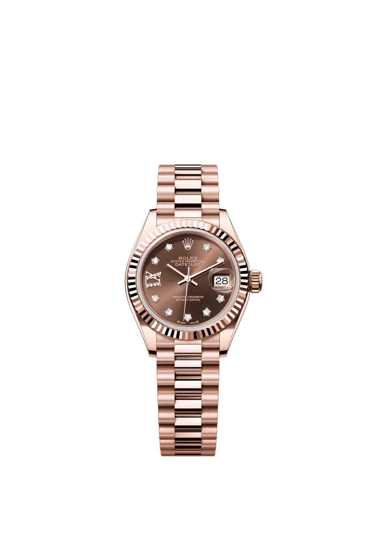 The Oyster Perpetual Lady-Datejust in 18 ct Everose gold with a chocolate-coloured diamond-set dial and a President bracelet. -m279175-0002 28mm