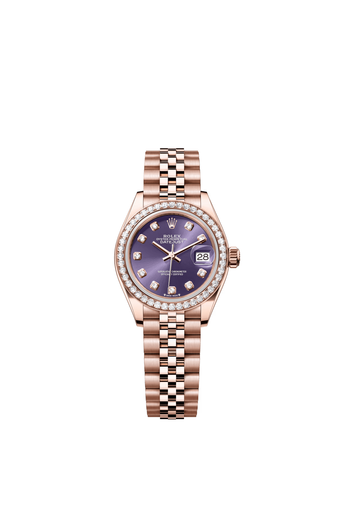 The Oyster Perpetual Lady-Datejust in 18 ct Everose gold with a diamond-set eggplant purple dial and a Jubilee bracelet. -m279135rbr-0011 28mm