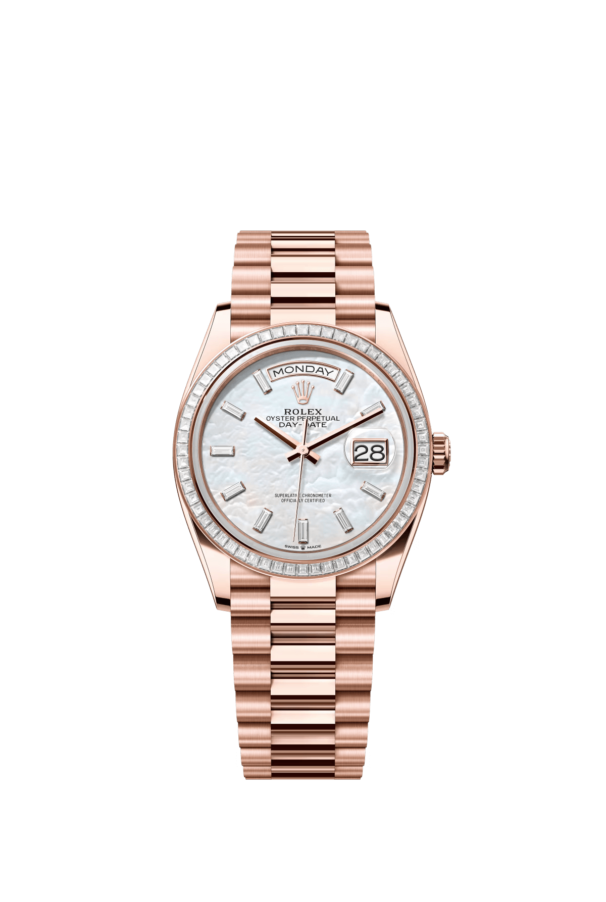 The Oyster Perpetual Day-Date 36 in 18 ct Everose gold, with a white mother-of-pearl, diamond-set dial, diamond-set bezel and a President bracelet.