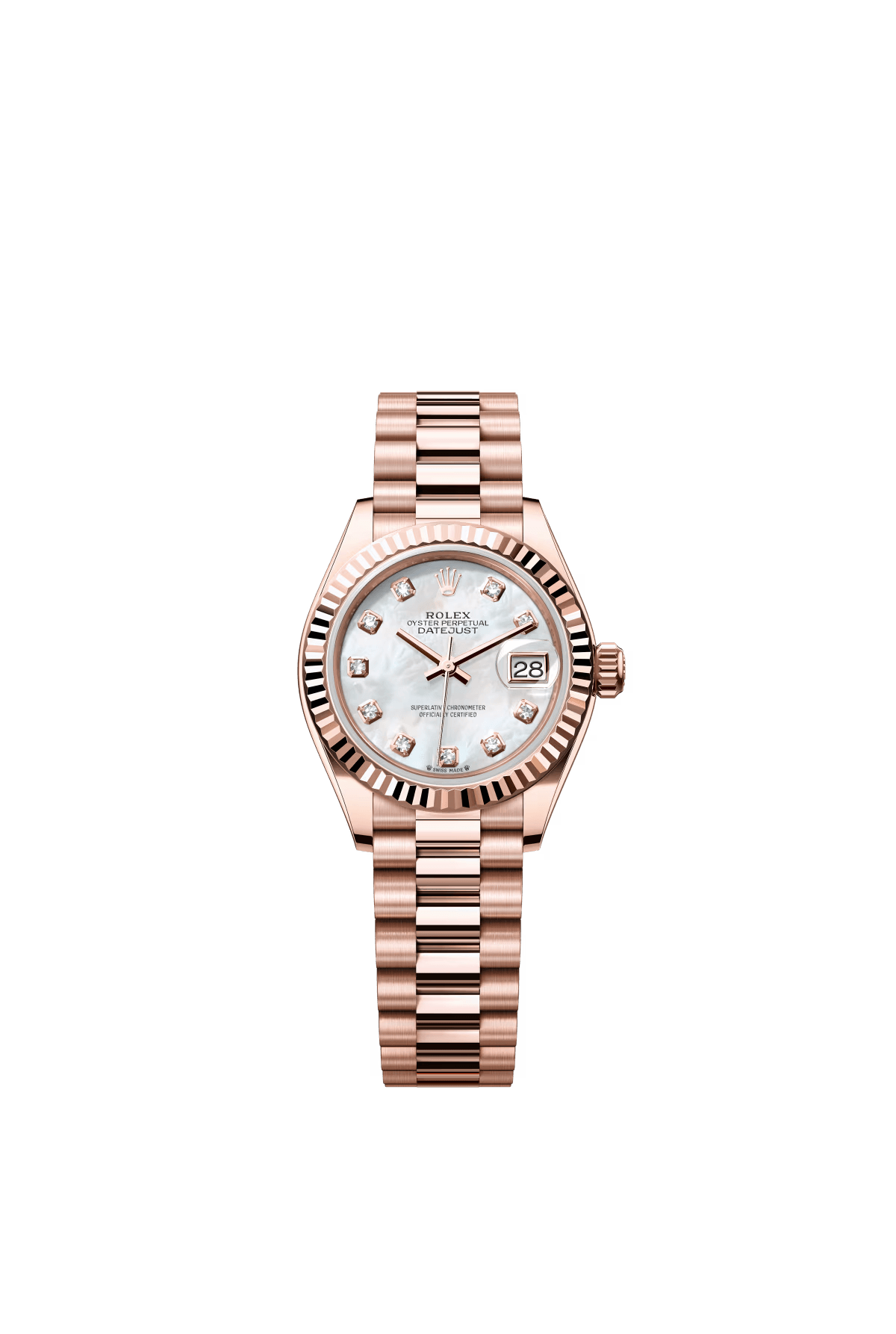 The Oyster Perpetual Lady-Datejust in 18 ct Everose gold with a diamond-set white mother-of-pearl dial and a President bracelet. -m279175-0017 28mm