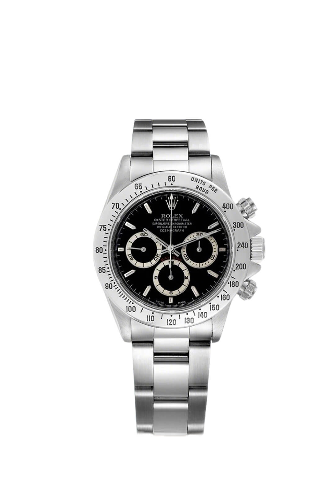 Daytona Swiss replica watches looks and function identical to a genuine Rolex. Our Swiss cloned Rolex chronograph movements feature every Rolex engraving, serial numbering and are lubed with Nano-oil Swiss lubricants and are designed to last a lifetime. Visually and functionally our chronograph movement 28.000 vibrations per hour offers the same fine sweep seconds hand “Rolex” motion as on the genuine Rolex. Our chronograph sub dials displays the seconds, minutes, hours and both screws down buttons are fully functional for the chronograph start-pause-stop functions.
