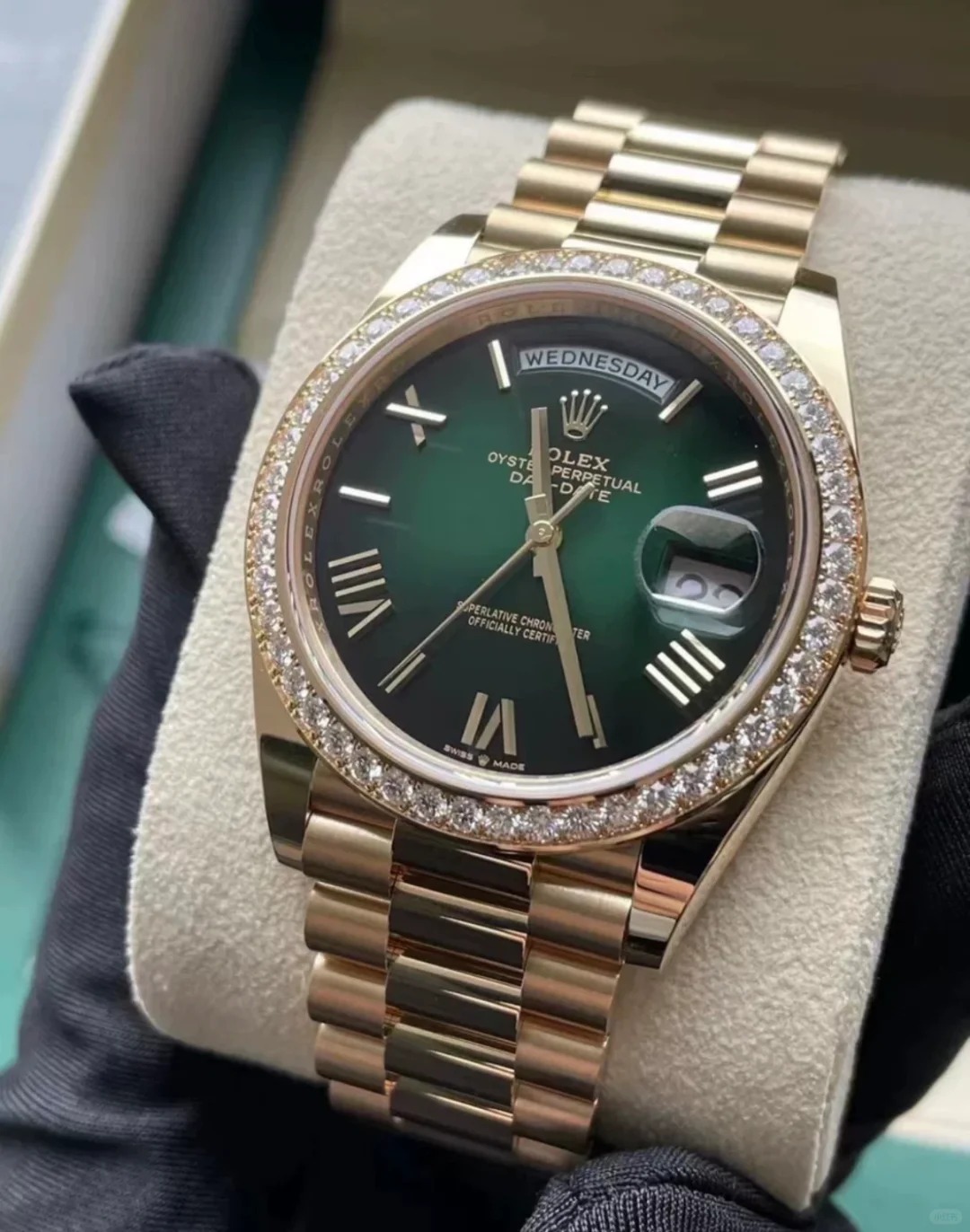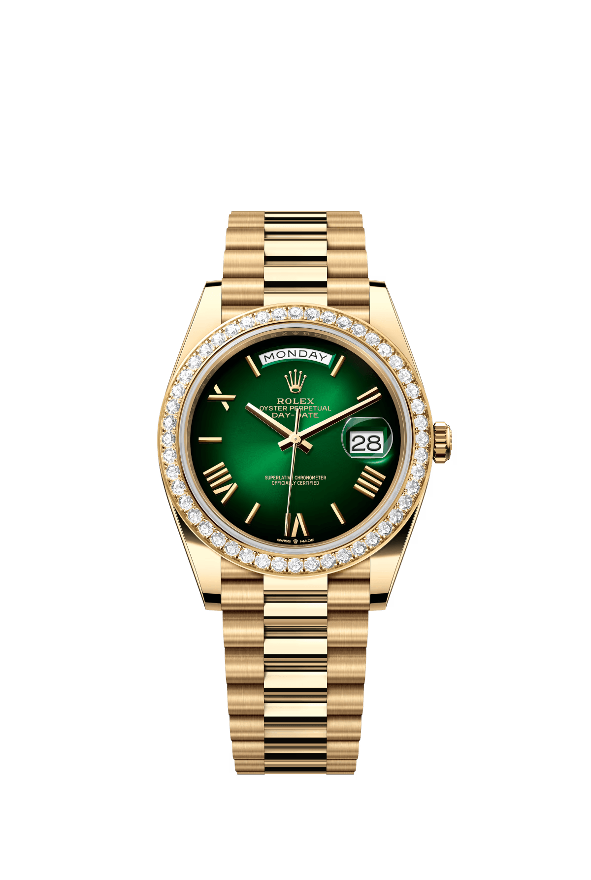 The Oyster Perpetual Day-Date 40 in 18 ct yellow gold with a green ombré dial, diamond-set bezel and a President bracelet.