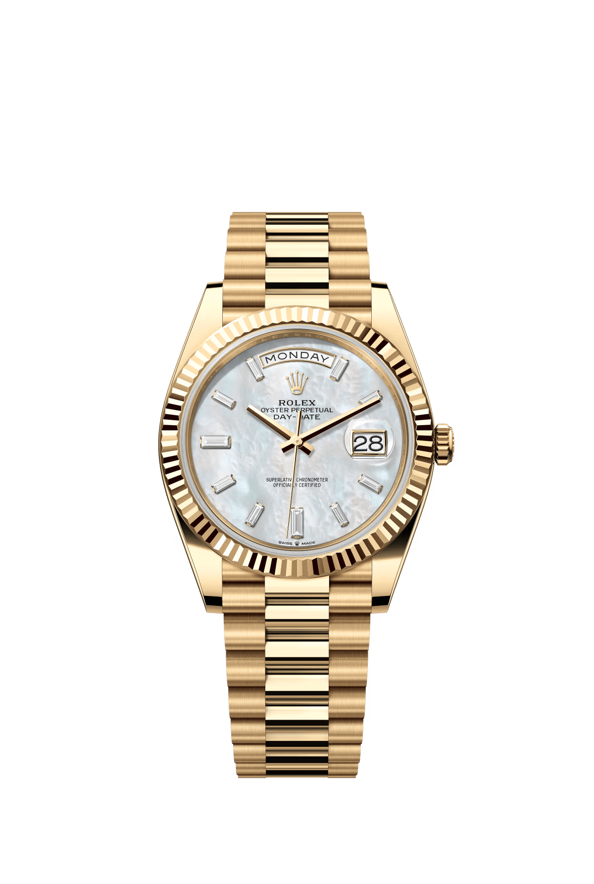 The Oyster Perpetual Day-Date 40 in 18 ct yellow gold with a white mother-of-pearl, diamond-set dial, fluted bezel and a President bracelet.