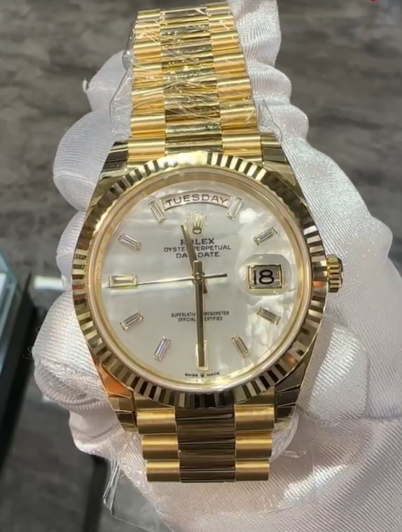 The Oyster Perpetual Day-Date 40 is in 18 ct yellow gold with a diamond-set white mother-of-pearl dial, fluted bezel and President bracelet. -m228238-0071