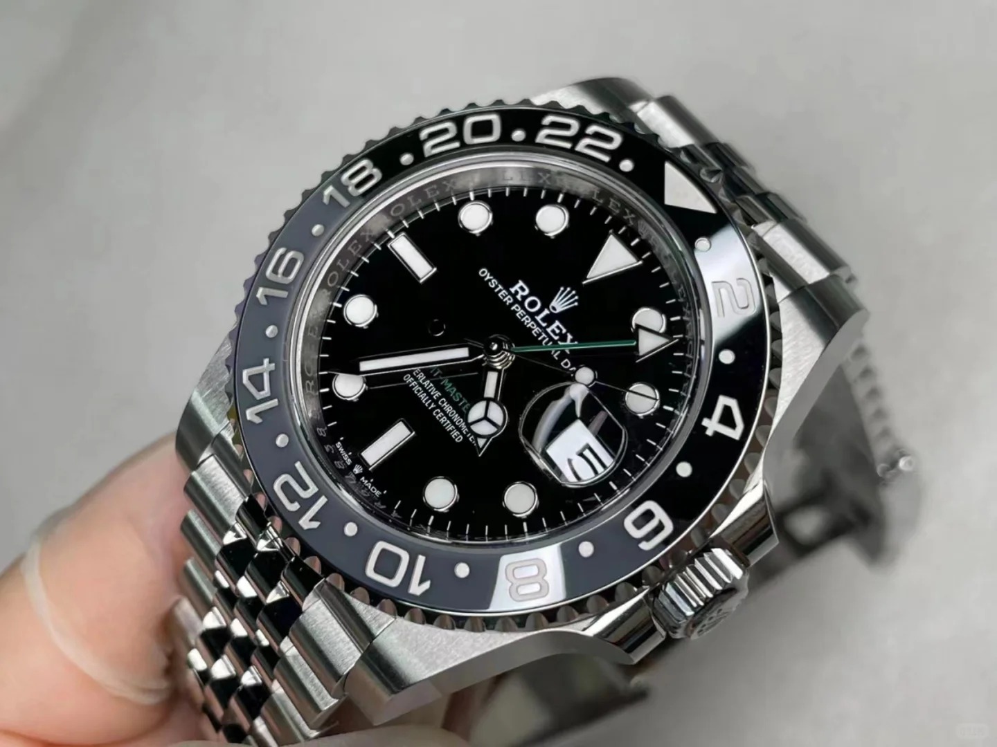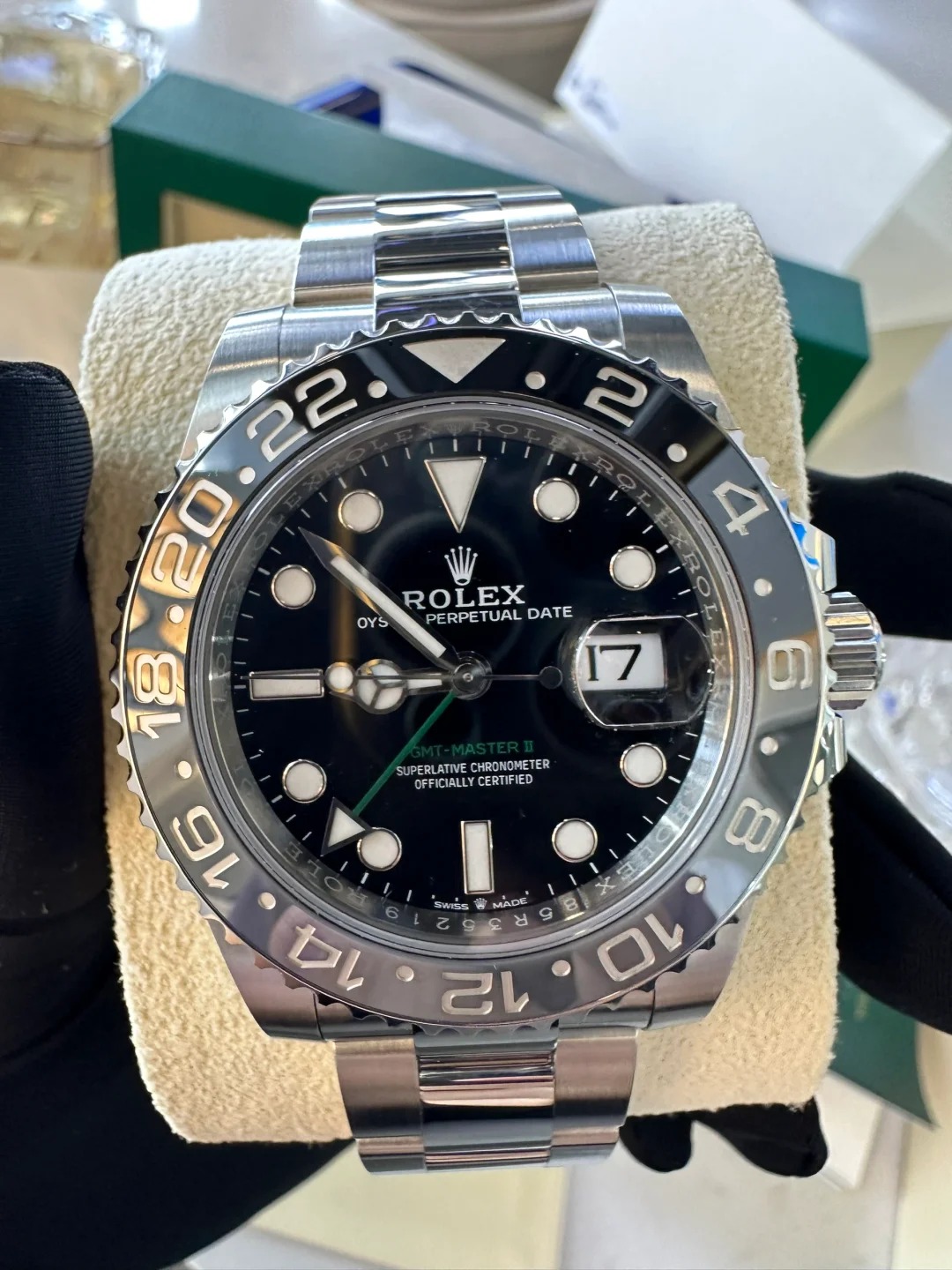 The Oyster Perpetual GMT-Master II is available in Oyster steel with a black dial and a Jubilee bracelet. -m126710grnr-0003 40mm