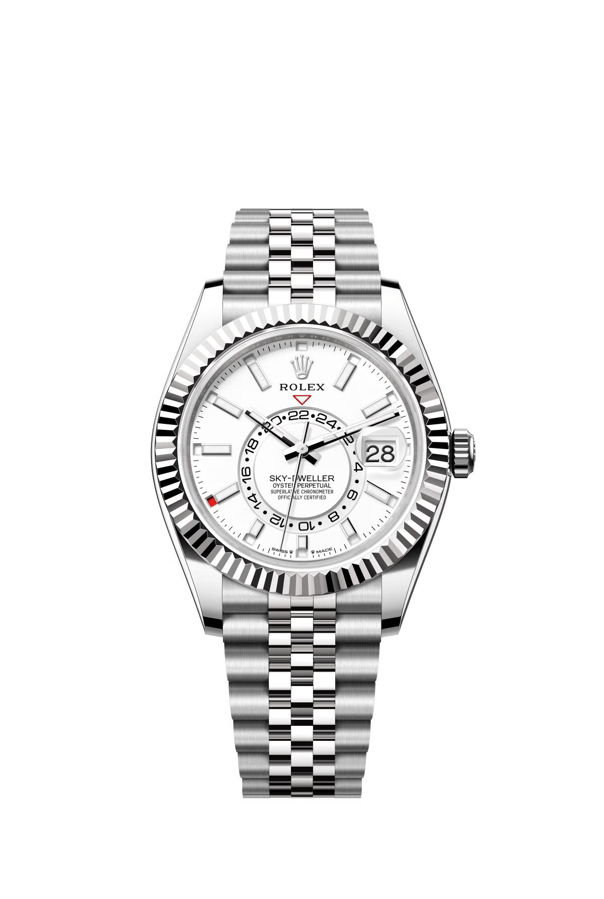 The Oyster Perpetual Sky-Dweller is available in white gold and Oystersteel with a mellow white dial and a Jubilee bracelet. -m336934-0004 42mm