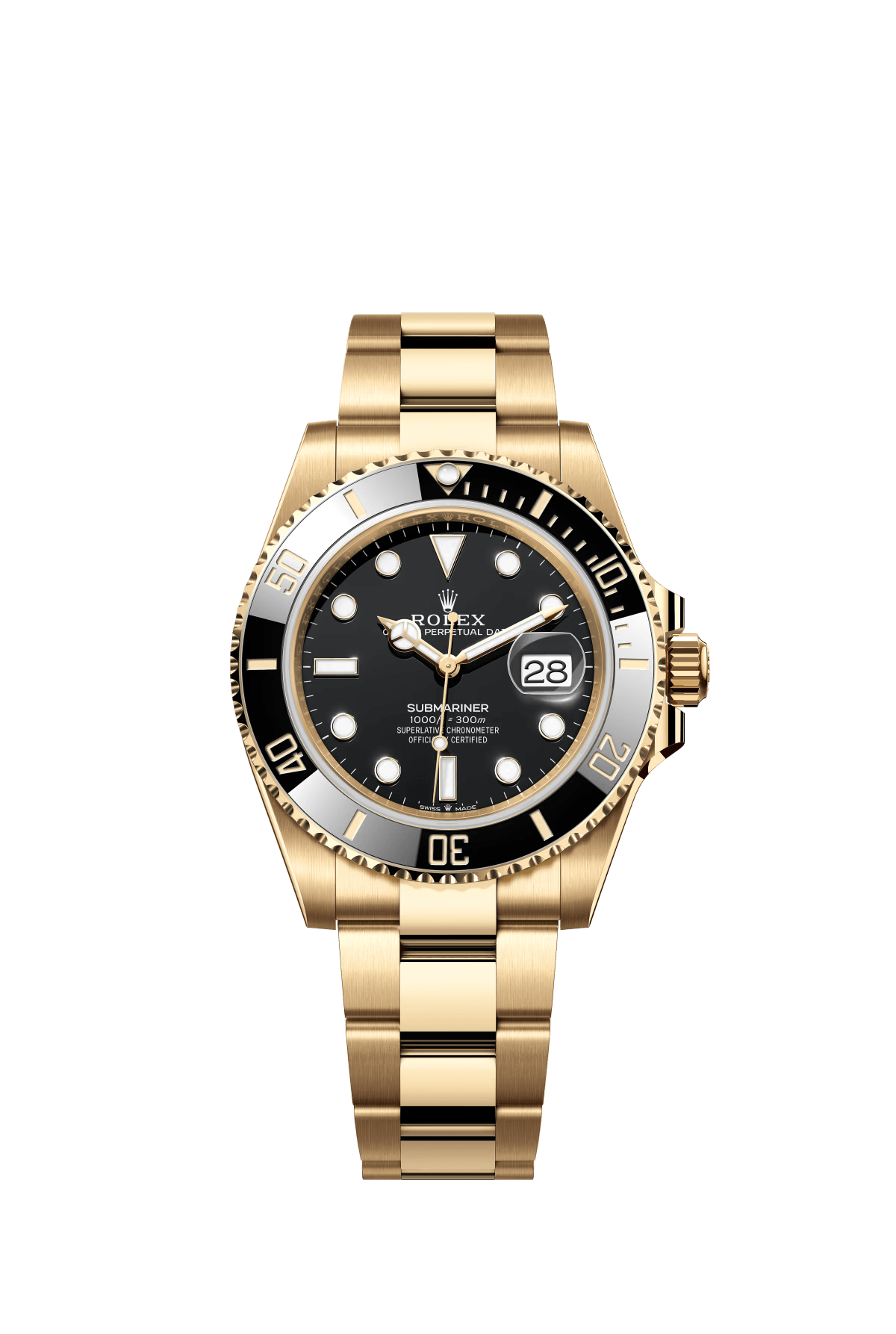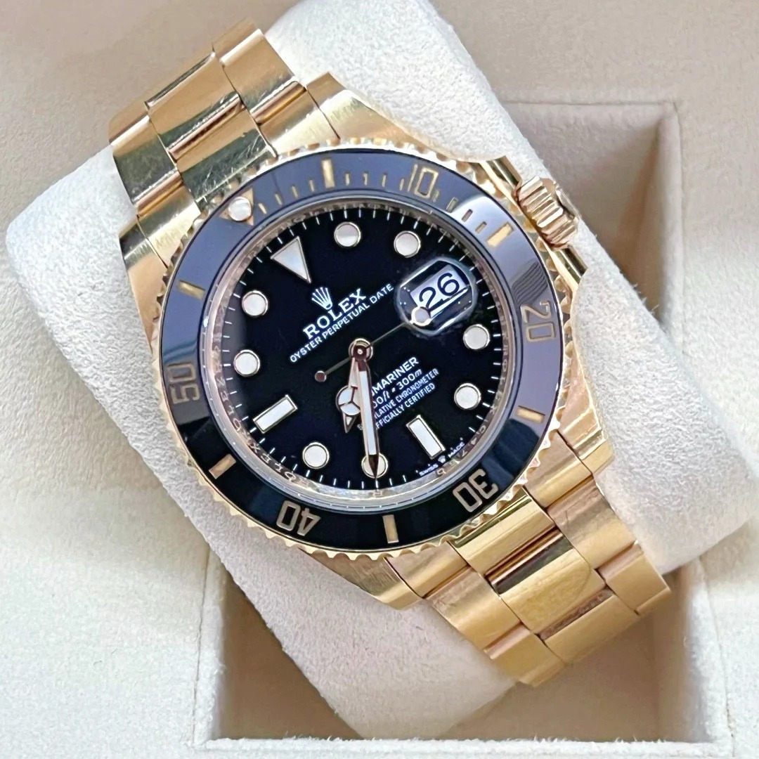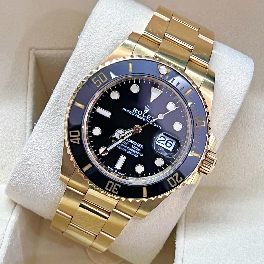 The Oyster Perpetual Submariner Date in 18 ct yellow gold with a Cerachrom bezel insert in black ceramic and a black dial with large luminescent hour markers.