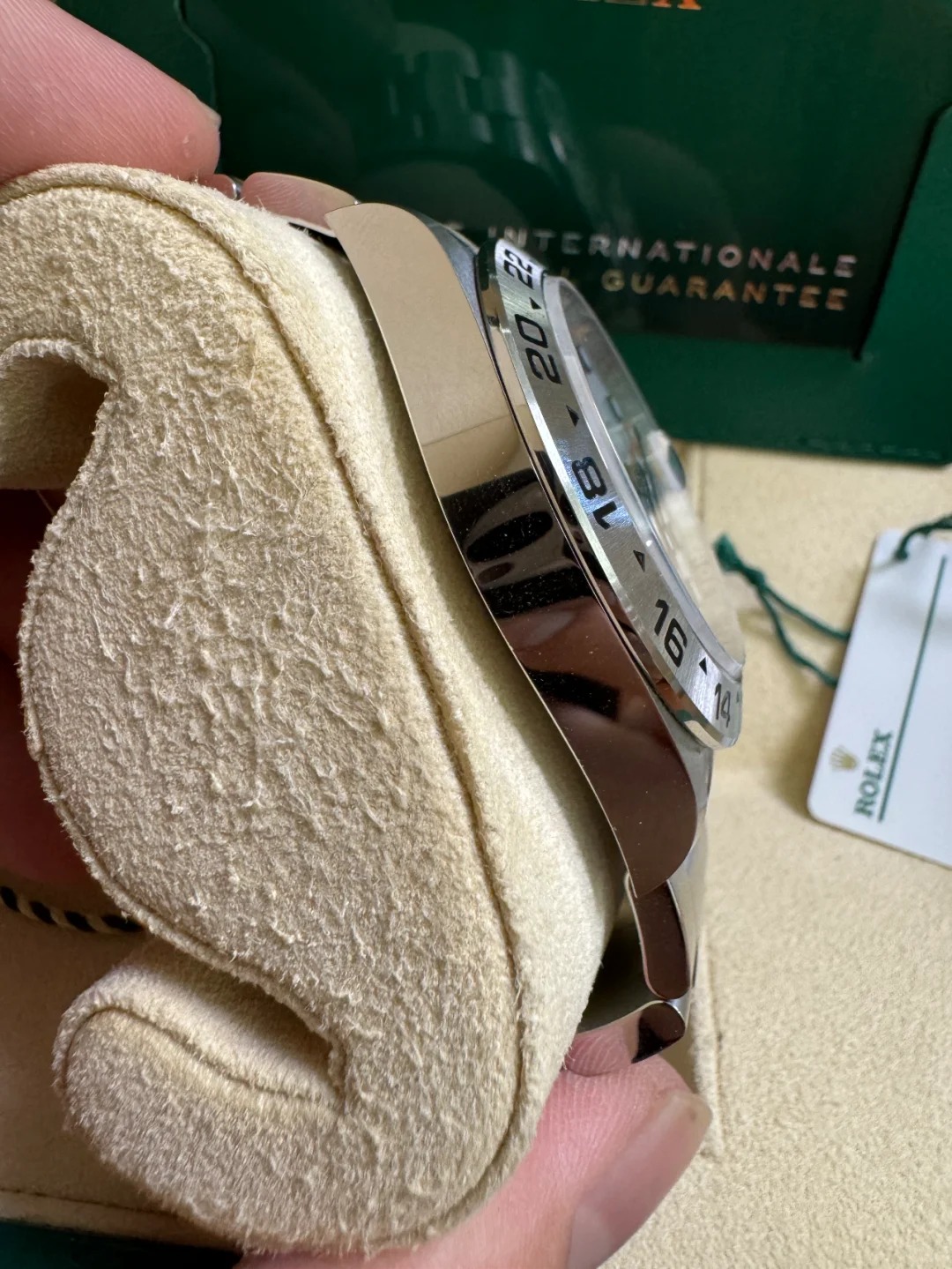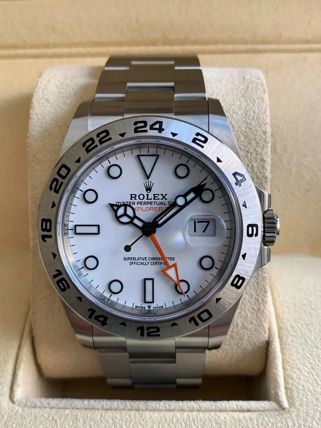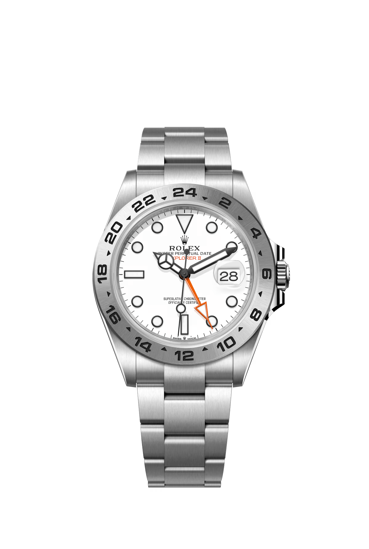 The Oyster Perpetual Explorer II is made of Oyster steel with an Oyster bracelet and a white dial with arrow-shaped 24-hour hands and hour markers coated with Chromalight. -m226570-0001 42mm